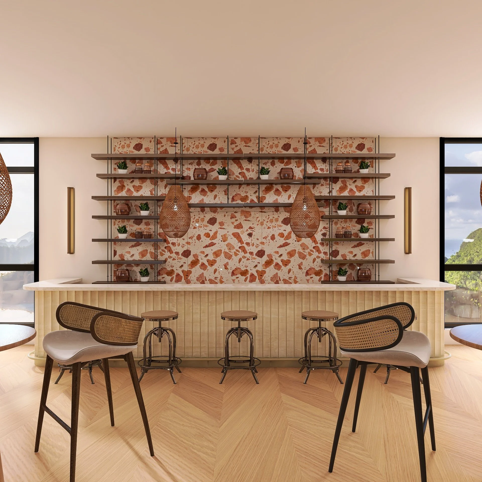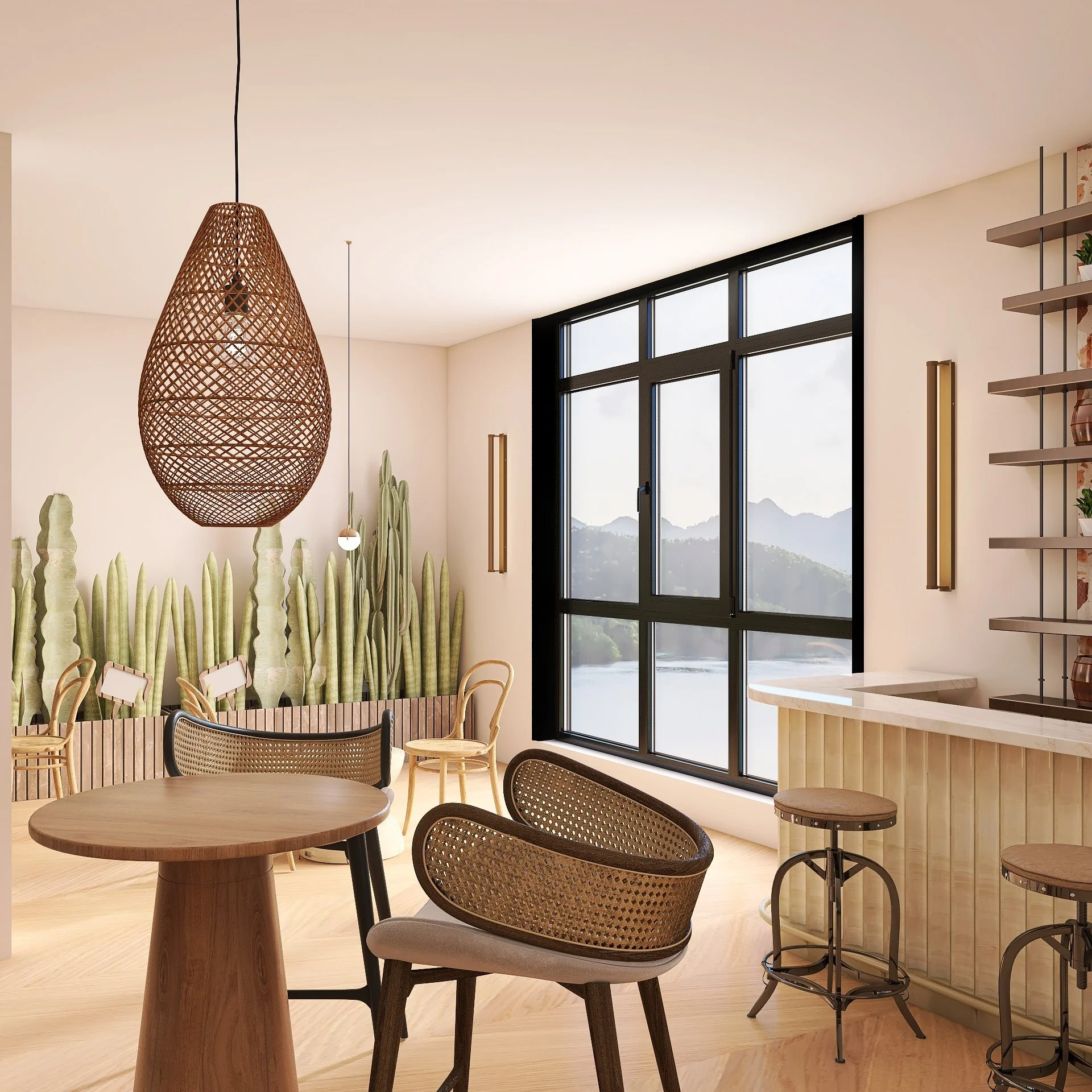 The goal was to create a café that celebrates rustic authenticity while maintaining an upscale, curated feel. The challenge was to integrate raw, natural elements like wood and stone with polished finishes and modern detailing, ensuring the café appeals to both casual visitors and design-conscious guests.